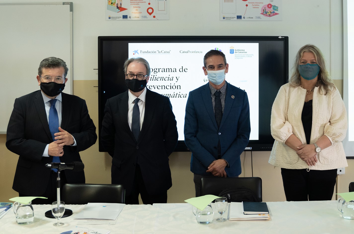 El subdirector general de la Fundació "la Caixa", Marc Simón; el director territorial de CaixaBank a Canàries, Juan Ramón Fuertes; el director general d'Ordenació, Innovació i Qualitat de la Conselleria d'Educació, Universitats, Cultura i Esports del Govern de Canàries, Gregorio José Cabrera, i la degana del Col·legi de Psicologia de Tenerife, Carmen Linares, han presentat aquest divendres a La Palma un nou programa de promoció de la resiliència i prevenció de l'estrès posttraumàtic per als infants de La Palma i els seus familiars, després de l'erupció del volcà de Cumbre Vieja que es va produir entre el setembre i desembre del 2021.