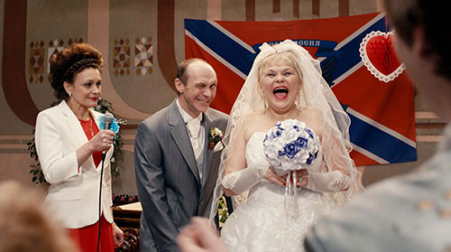 També fa gala de diferents registres, com la paròdia i el grotesc, com el cas d'un casament d'una parella de rebels russos, o també l'absurd i la comicitat en d'altres escenes. Altres són moments de crueltat, com la vexació pública de les víctimes, i en altres aborda la discrecionalitat de les autoritats i la corrupció enquistada. Però també es fa ressò de la violència seca, a través d'explosions, que arriben de manera imprevista, la guerra en estat brut amb el seu reguitzell incomprensible de víctimes.  'Donbass'