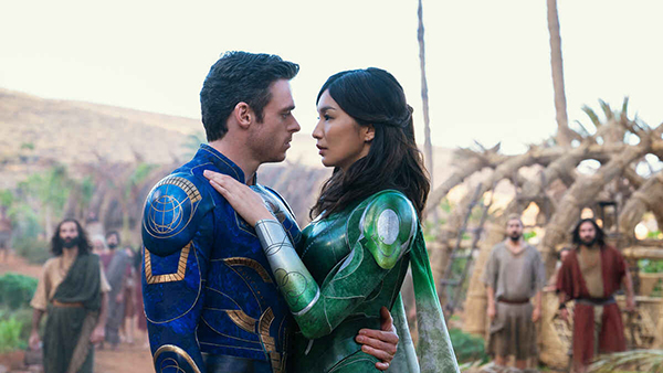 Gemma Chan i Richard Madden a la pel·lícula 'Eternals' Tot indica que ha arribat un moment d'emergència i comença la crida pel reagrupament dels altres membres Eternals per fer front a un sorgiment de maldat i salvar el planeta de la seva devastació segura. Aquest film coral i extremadament dispers aborda la interculturalitat i el mestissatge en un grup format per orientals, hindús i anglosaxons, blancs i negres, homes i dones. El film té un caire humanista i idealista que combina amb dosis d'ironia i humor, les corresponents cites i picades d'ullet i, també, bones dosis d'acció amb escenes espectaculars. Malauradament, el conjunt desprèn certa monotonia i ensopiment. |