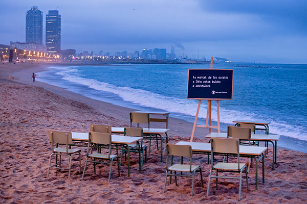 Pupitres buits a la Barceloneta per denunciar que el 50% d'escoles a Síria han estat destruïdes